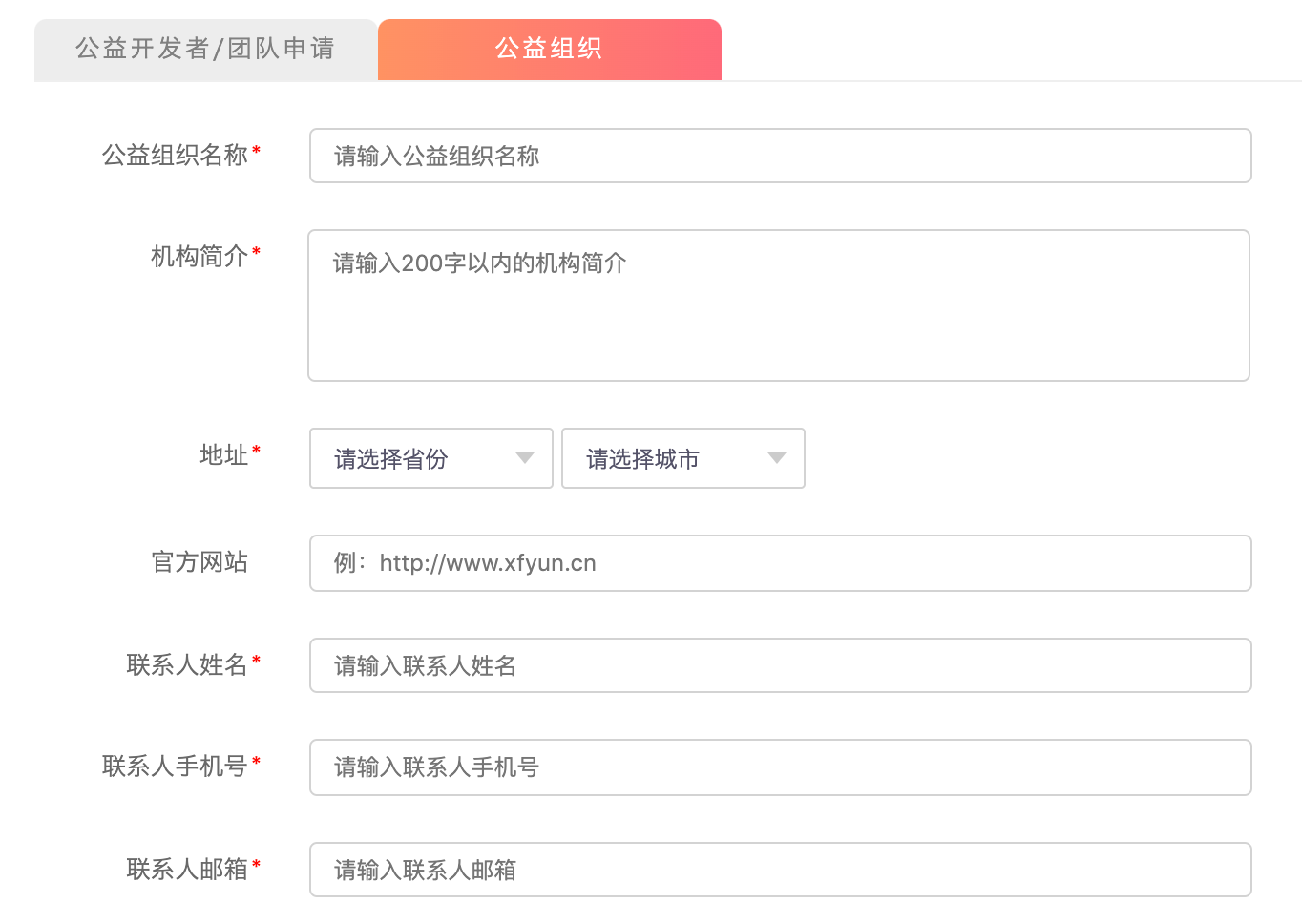 根据页面提示,填写公益开发者/团队信息或公益组织信息。(用户可根据自身实际情况选择申请)
