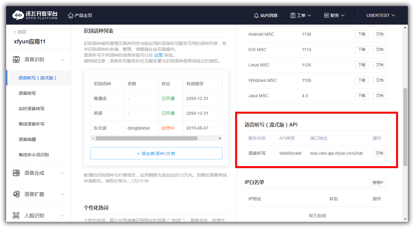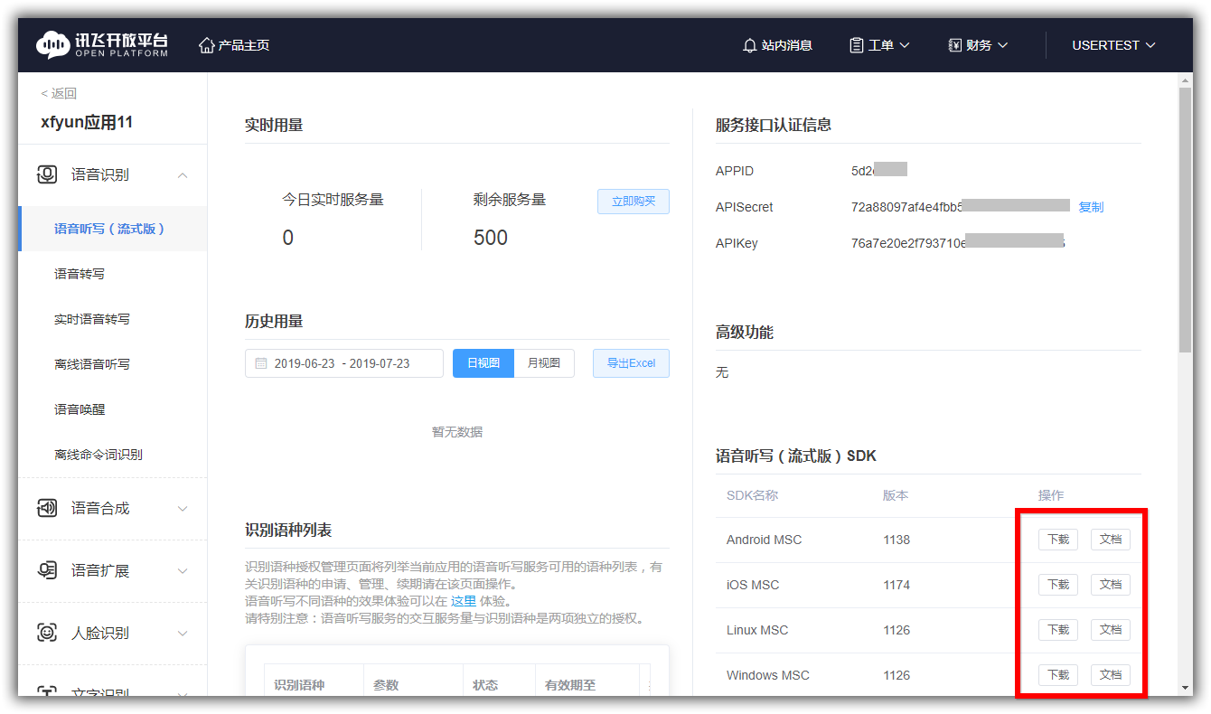 在进入控制台对应的服务管理页之后,您就可以通过下载SDK或者获取WebAPI接口,接入AI服务做测试了。